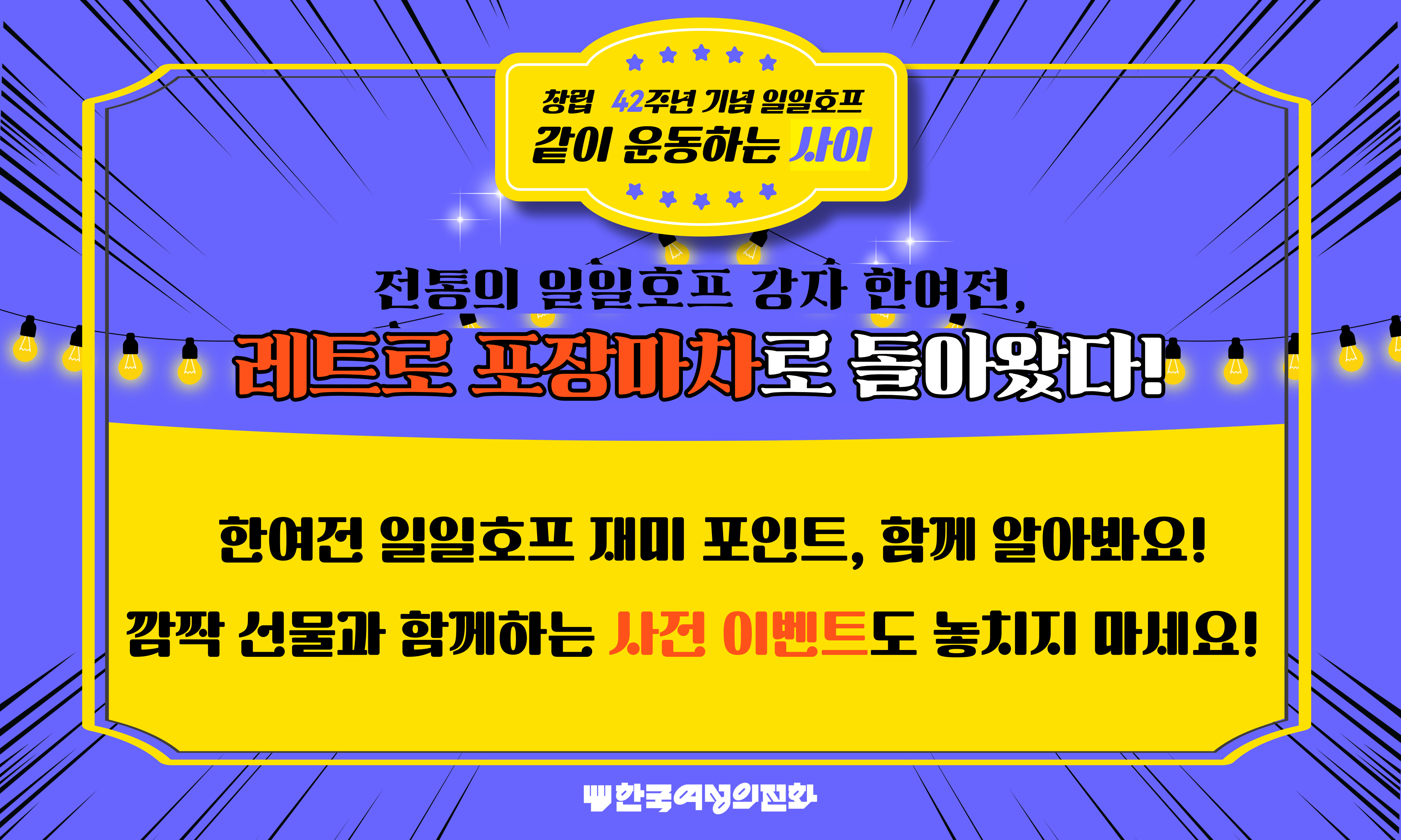 - 한국여성의전화 42주년 기념 후원행사 <같이 운동하는 사이>가 11월 22일 토요일로 다가왔어요!🎉 레트로 포장마차로 돌아온 전설의 일일호프 강자 한여전! 이번 행사를 200% 즐길 수 있는 사전 이벤트도 안내드려요.🎁