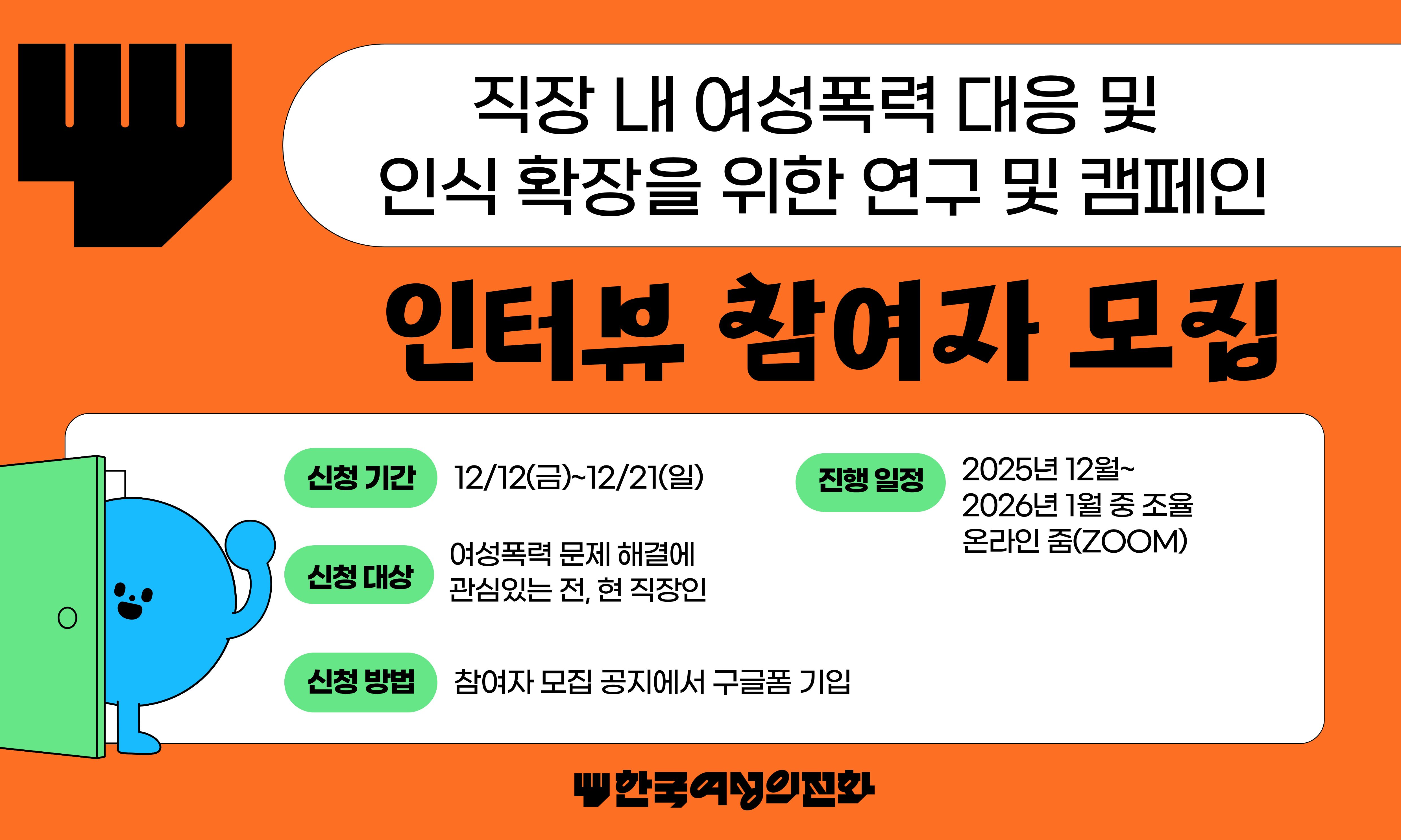 직장 내 여성폭력 대응 및 인식 확장 연구 및 캠페인 진행을 위해 직장인 대상 인터뷰 참여자를 모집합니다!🔊